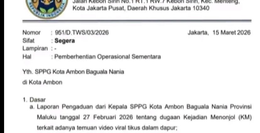 Surat bernomor 951/D.TWS/03/2026 tertanggal 15 Maret 2026 itu ditujukan kepada SPPG Kota Ambon Baguala Nania dengan perihal “Pemberhentian Operasional Sementara”.