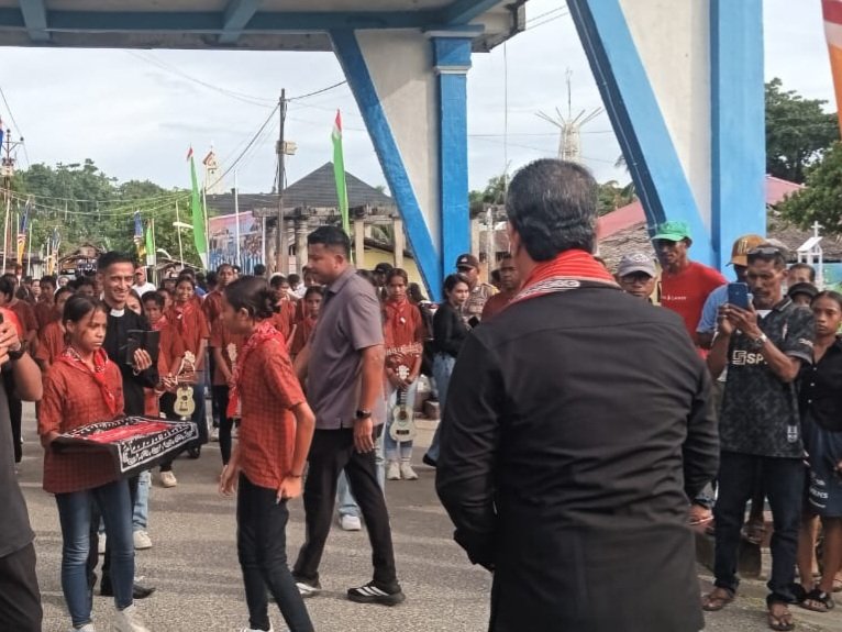 Diiringi alunan musik suling yang lirih dan sakral, rombongan bergerak perlahan menuju lokasi acara. Prosesi ini dipimpin Pdt. J. Haurissa bersama Raja Negeri Ouw, Wellem Pelupessy, menciptakan pemandangan yang mengikat iman, adat, dan sejarah dalam satu langkah bersama.