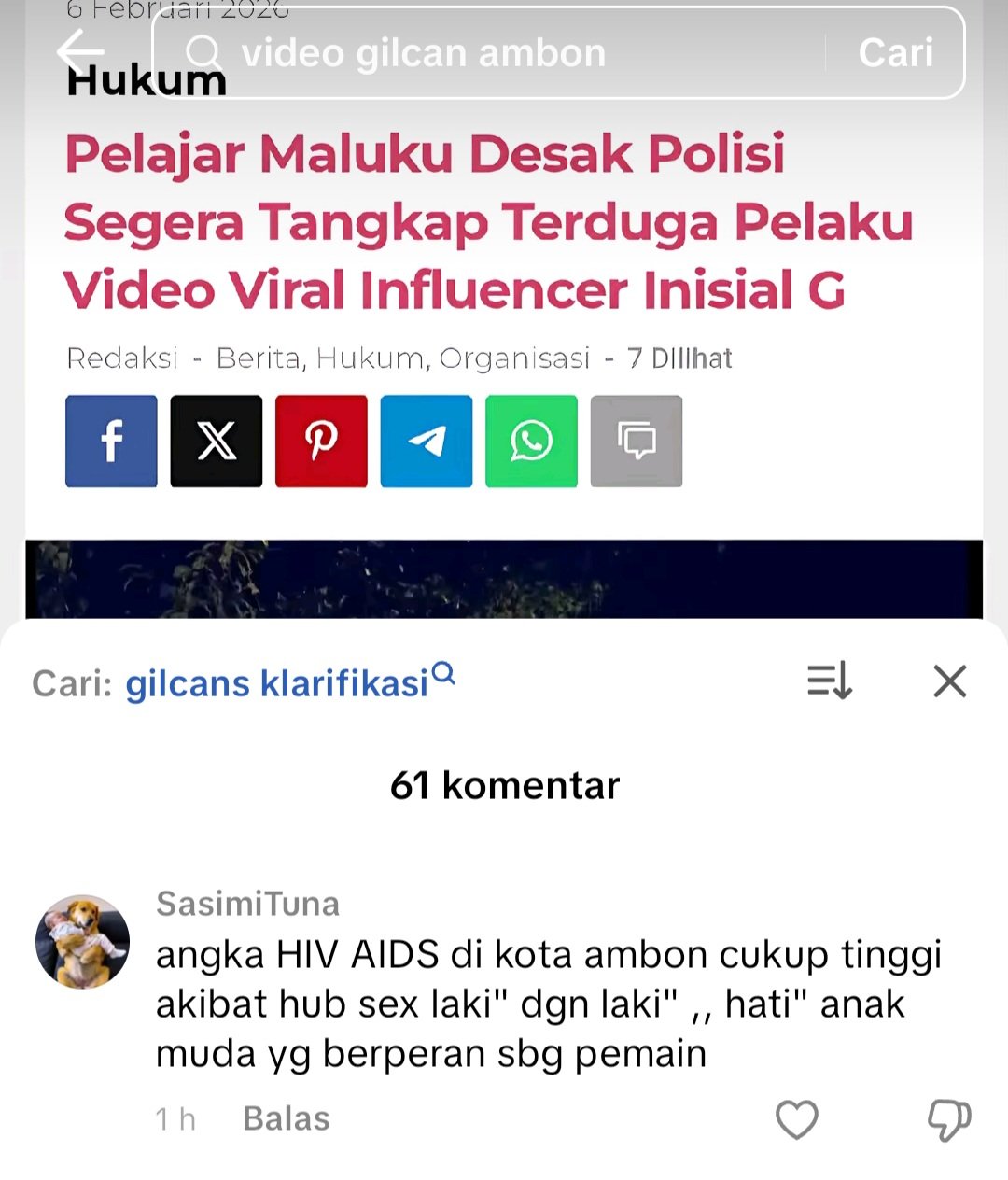 Dilansir pada Senin (9/2/2026), di kolom komentar akun TikTok @babeto.id, khususnya pada unggahan berjudul “Pelajar Maluku Desak Polisi Segera Tangkap Terduga Pelaku Video Viral, Influencer Inisial G”.