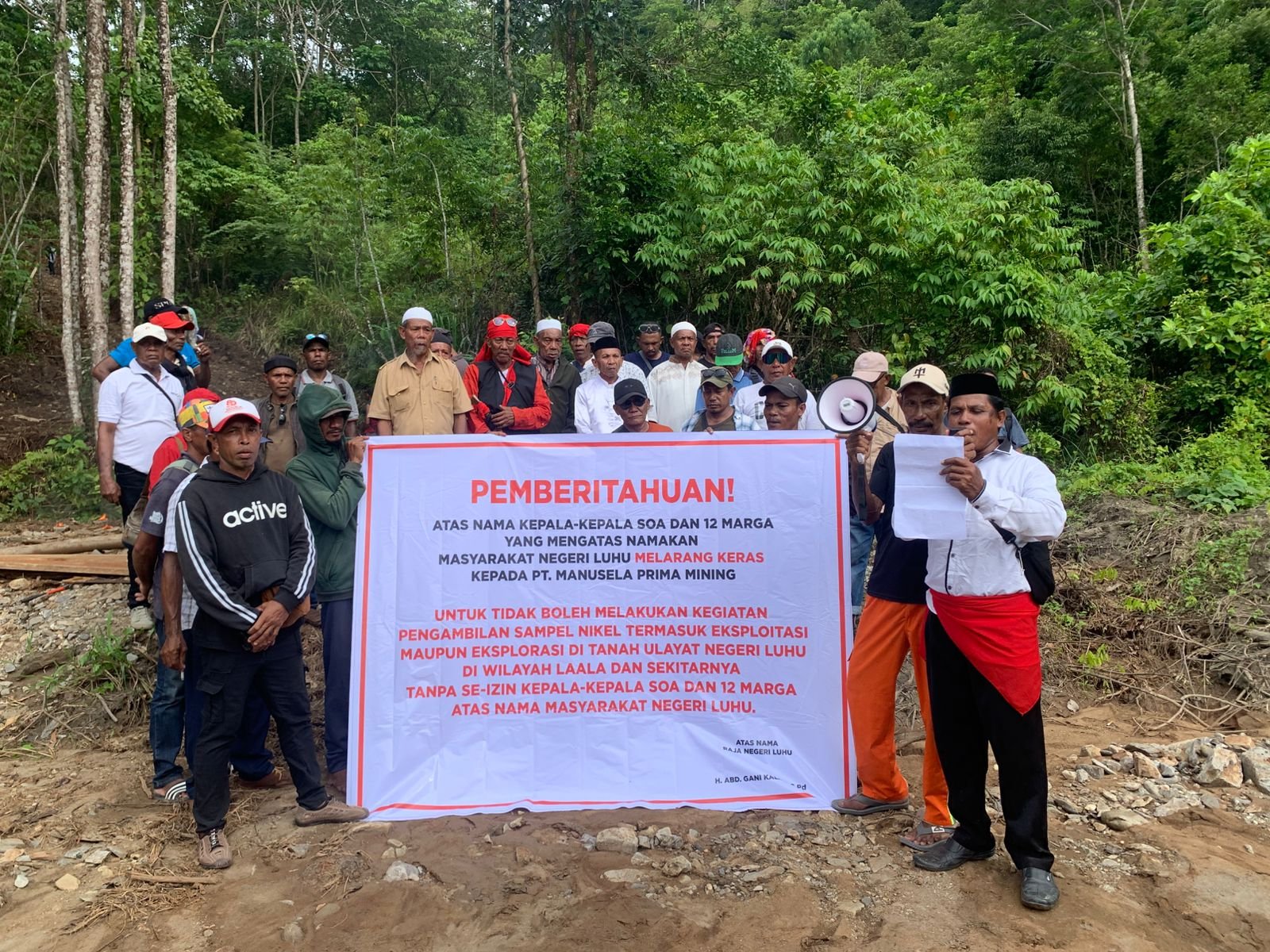 “Kami menolak dengan tegas PT Manusela Prima Mining untuk melakukan pengambilan sampel nikel maupun kegiatan eksplorasi dan eksploitasi lainnya di tanah ulayat Negeri Luhu tanpa izin kepala soa, 12 marga, dan pemerintah negeri,” demikian bunyi pernyataan tersebut.