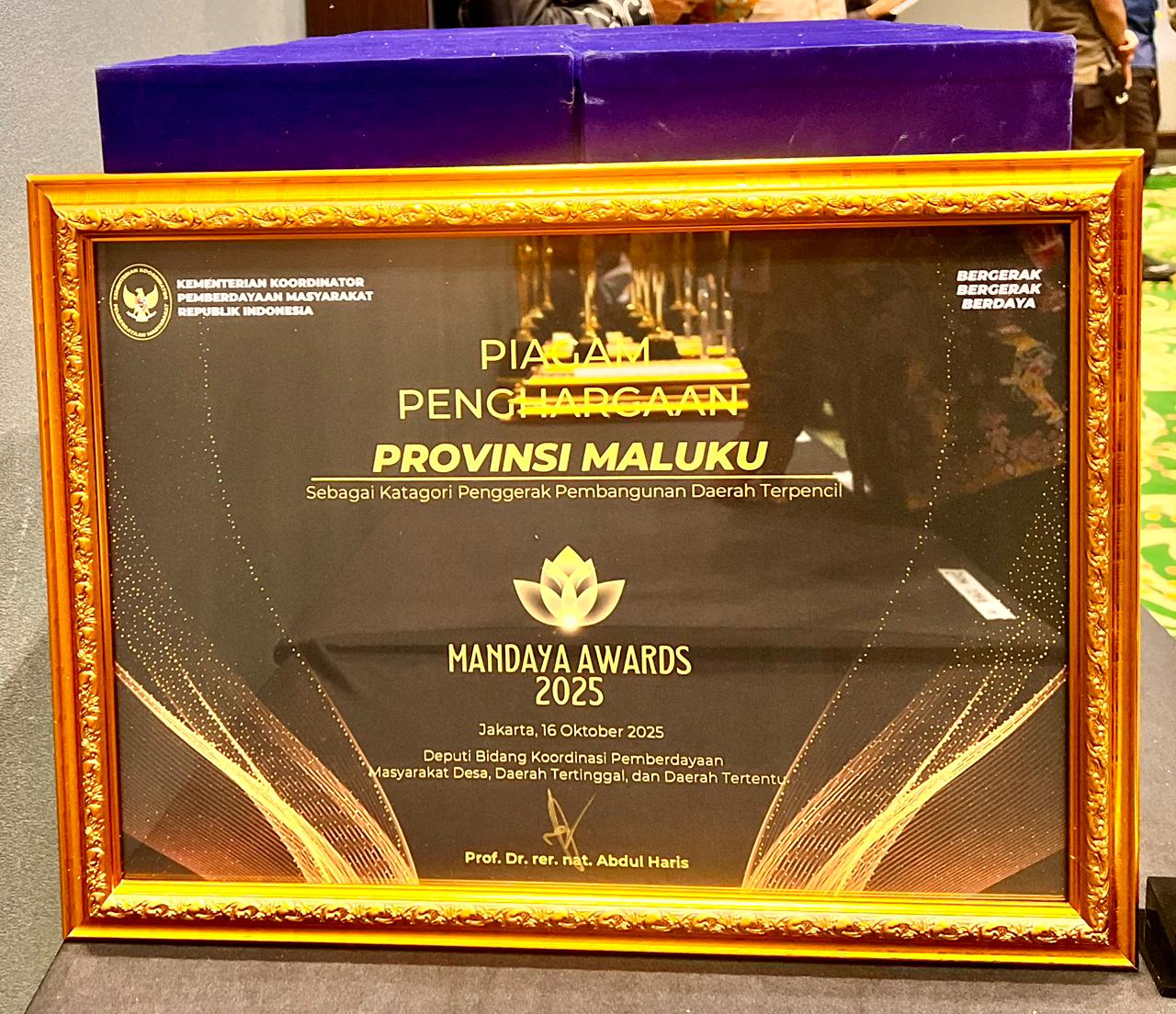 JAKARTA, BABETO.ID — Provinsi Maluku meraih peringkat kedua dalam kategori Penggerak Daerah Terpencil pada ajang Mandaya Awards 2025 yang diselenggarakan oleh Kementerian Koordinator Bidang Pemberdayaan Masyarakat Republik Indonesia, bertempat di Ballroom Lantai 6, Plaza Jamsostek, pada Kamis (16/10/2025)