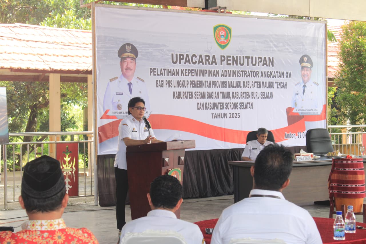 AMBON, BABETO.ID,– Sekretaris Daerah (Sekda) Provinsi Maluku, Ir. Sadali Ie, menghadiri penutupan Pelatihan Kepemimpinan Administrator (PKA) Angkatan XV Tahun 2025 yang dilaksanakan di Kantor Badan Pengembangan Sumber Daya Manusia (BPSDM) Provinsi Maluku, pada Rabu (22/10/2025).