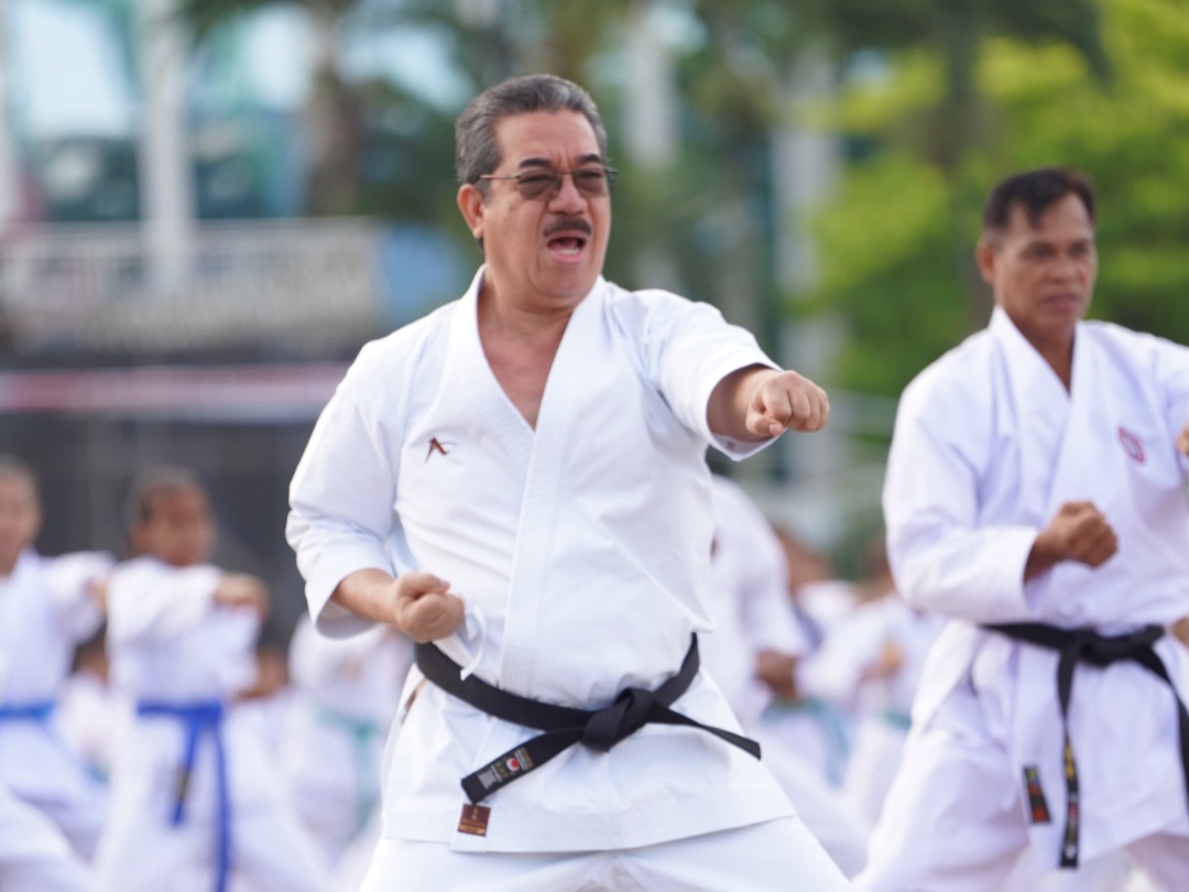 AMBON, BABETO.ID – Gubernur Maluku, Hendrik Lewerissa menunjukan skill karate-do dengan sabuk hitam di Lapangan Merdeka, Kota Ambon, bersama puluhan peserta yang hadir.